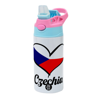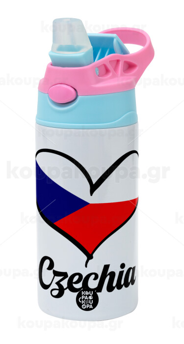Czechia flag, Children's hot water bottle, stainless steel, with safety straw, Pink/BlueCiel (360ml) BPA FREE