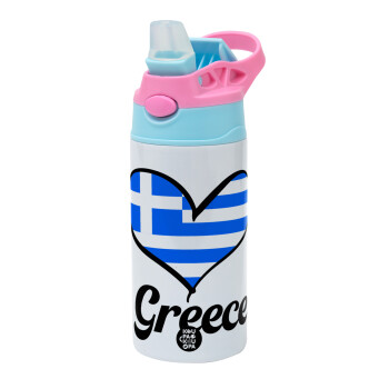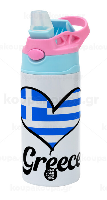 Greece flag, Children's hot water bottle, stainless steel, with safety straw, Pink/BlueCiel (360ml) BPA FREE