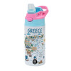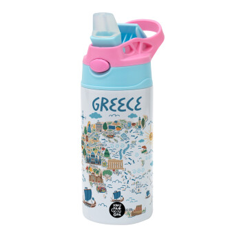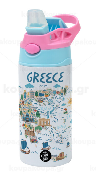 Greek map, Children's hot water bottle, stainless steel, with safety straw, Pink/BlueCiel (360ml) BPA FREE