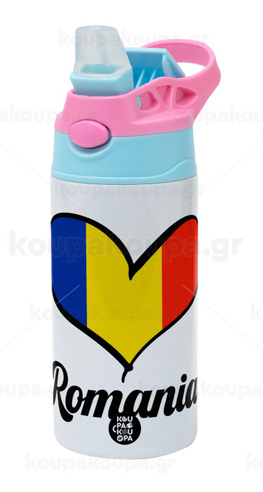 Romania flag, Children's hot water bottle, stainless steel, with safety straw, Pink/BlueCiel (360ml) BPA FREE