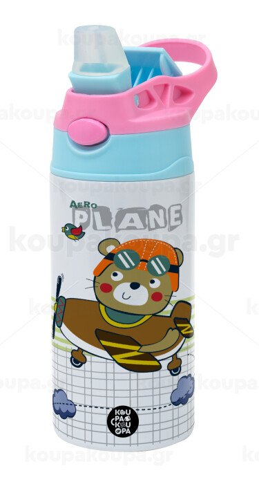 Kids Plane, Children's hot water bottle, stainless steel, with safety straw, Pink/BlueCiel (360ml) BPA FREE