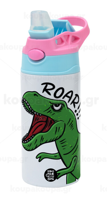 Dyno roar!!!, Children's hot water bottle, stainless steel, with safety straw, Pink/BlueCiel (360ml) BPA FREE