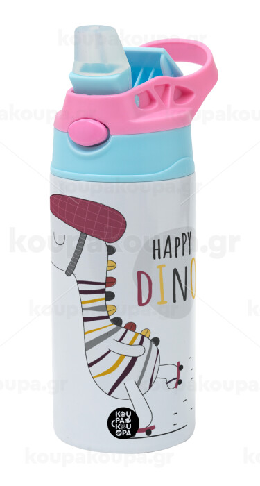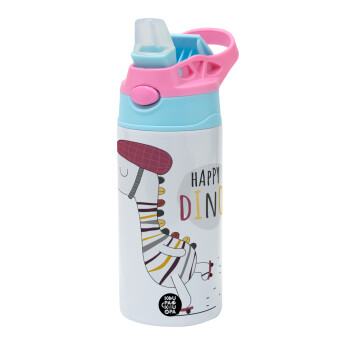 Happy Dino, Children's hot water bottle, stainless steel, with safety straw, Pink/BlueCiel (360ml) BPA FREE