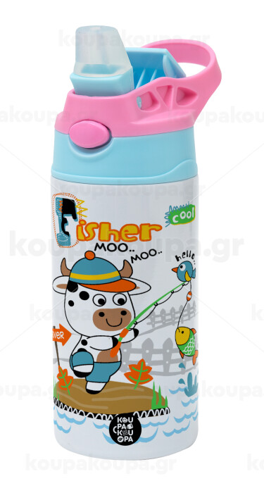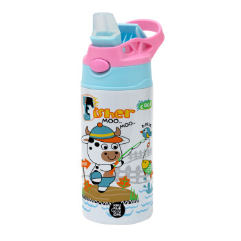 Kids Fisherman, Children's hot water bottle, stainless steel, with safety straw, Pink/BlueCiel (360ml) BPA FREE