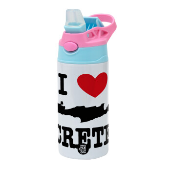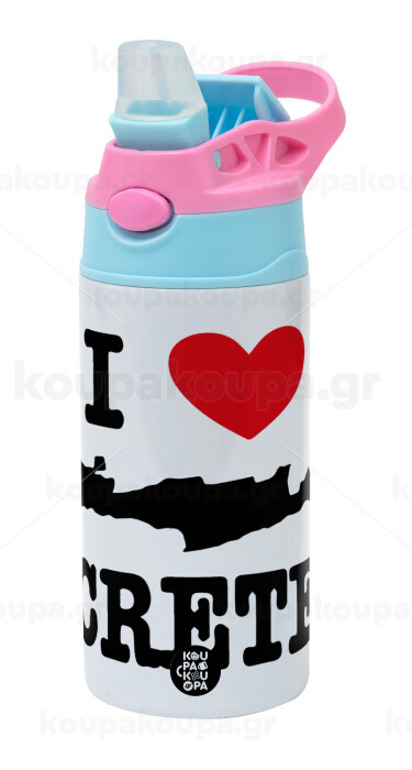 I Love Crete, Children's hot water bottle, stainless steel, with safety straw, Pink/BlueCiel (360ml) BPA FREE