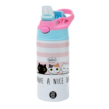 Have a nice day cats, Children's hot water bottle, stainless steel, with safety straw, Pink/BlueCiel (360ml) BPA FREE