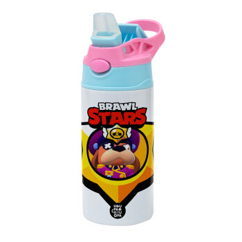 Brawl Stars Ruffs, Children's hot water bottle, stainless steel, with safety straw, Pink/BlueCiel (360ml) BPA FREE