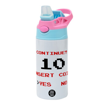 Continue? YES - NO, Children's hot water bottle, stainless steel, with safety straw, Pink/BlueCiel (360ml) BPA FREE