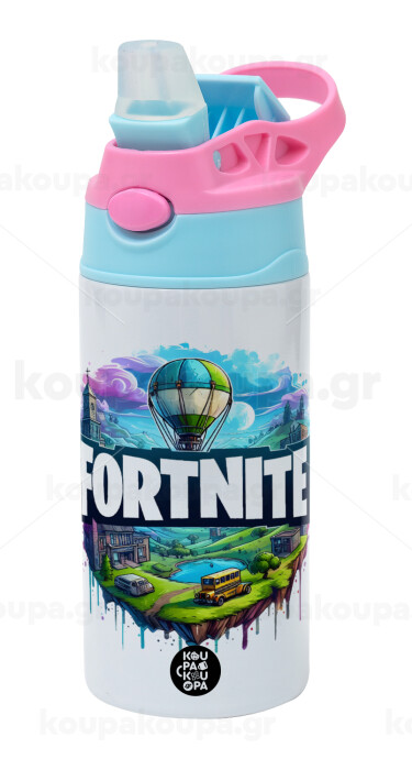 Fortnite land, Children's hot water bottle, stainless steel, with safety straw, Pink/BlueCiel (360ml) BPA FREE
