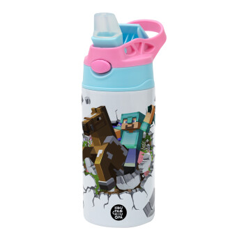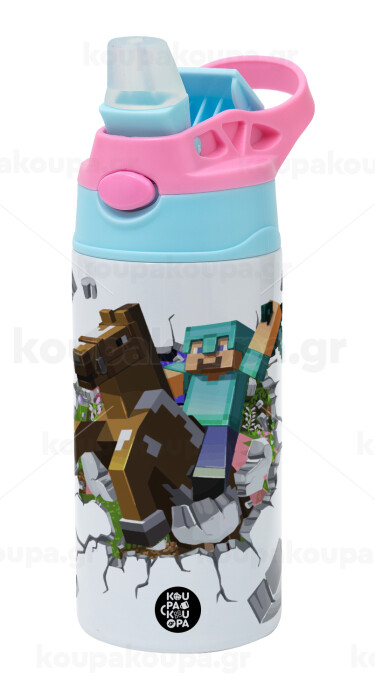 Minecraft brick, Children's hot water bottle, stainless steel, with safety straw, Pink/BlueCiel (360ml) BPA FREE