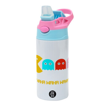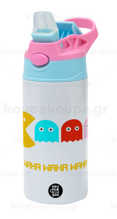 Pacman waka waka waka, Children's hot water bottle, stainless steel, with safety straw, Pink/BlueCiel (360ml) BPA FREE