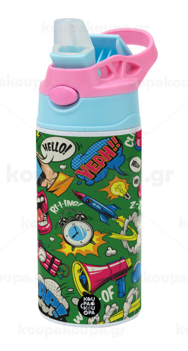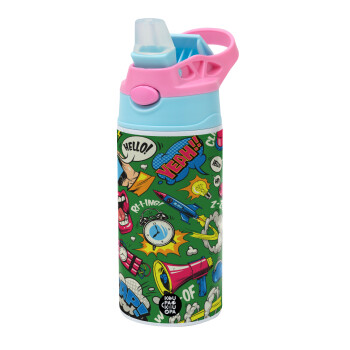 Pop art colorful seamless, Children's hot water bottle, stainless steel, with safety straw, Pink/BlueCiel (360ml) BPA FREE