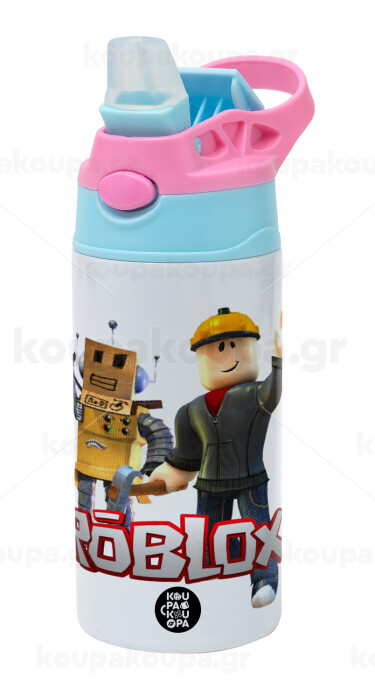 Roblox, Children's hot water bottle, stainless steel, with safety straw, Pink/BlueCiel (360ml) BPA FREE