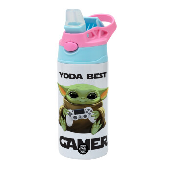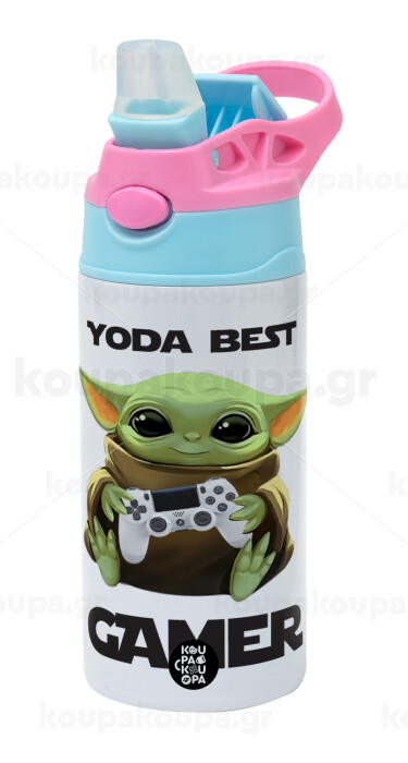 Yoda Best Gamer, Children's hot water bottle, stainless steel, with safety straw, Pink/BlueCiel (360ml) BPA FREE