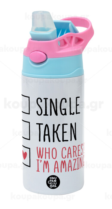 Single, Taken, Who cares i'm amazing, Children's hot water bottle, stainless steel, with safety straw, Pink/BlueCiel (360ml) BPA FREE