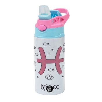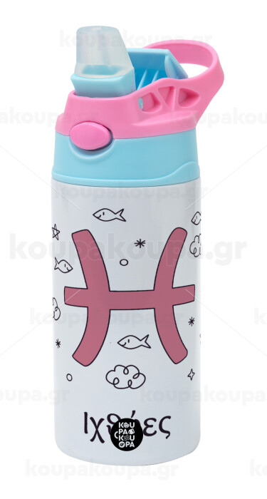 Ζώδια Ιχθύες, Children's hot water bottle, stainless steel, with safety straw, Pink/BlueCiel (360ml) BPA FREE