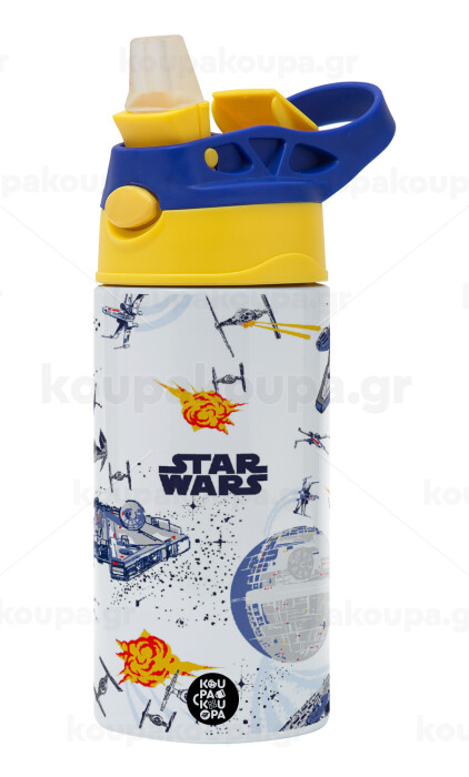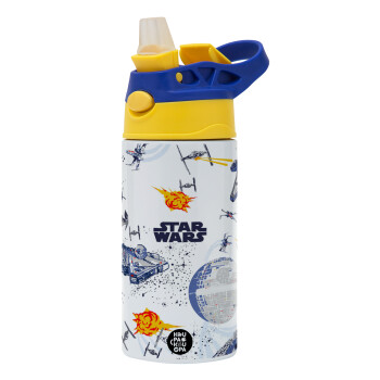 Star wars drawing, Children's hot water bottle, stainless steel, with safety straw, green, blue (360ml) BPA FREE