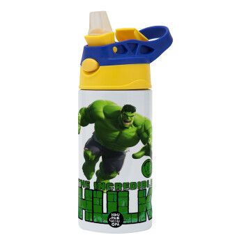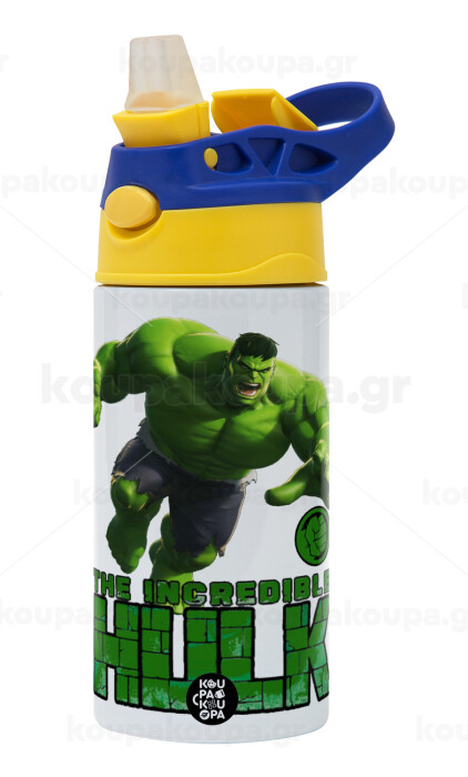 Hulk, Children's hot water bottle, stainless steel, with safety straw, green, blue (360ml) BPA FREE