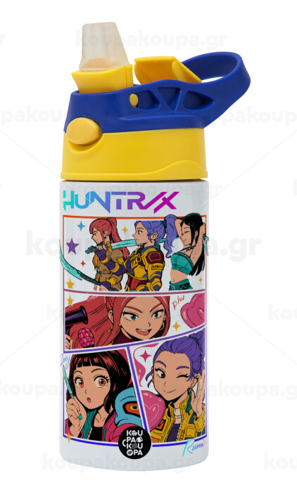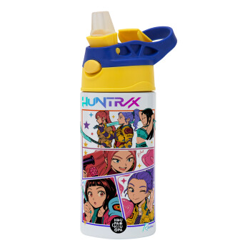 Huntrix Kpop Girls, Children's hot water bottle, stainless steel, with safety straw, green, blue (360ml) BPA FREE