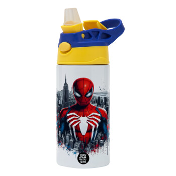 Spiderman City, Children's hot water bottle, stainless steel, with safety straw, green, blue (360ml) BPA FREE