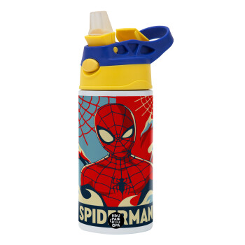 Spiderman kid, Children's hot water bottle, stainless steel, with safety straw, green, blue (360ml) BPA FREE