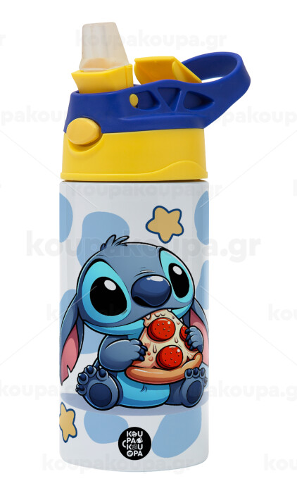 Stitch Pizza, Children's hot water bottle, stainless steel, with safety straw, green, blue (360ml) BPA FREE