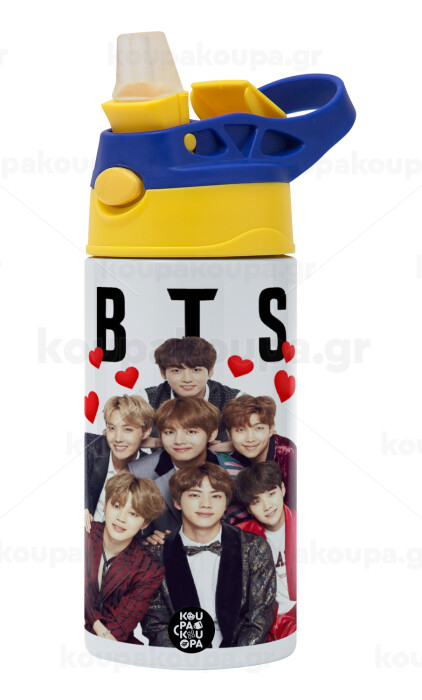 BTS hearts, Children's hot water bottle, stainless steel, with safety straw, green, blue (360ml) BPA FREE