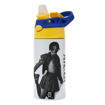 Maneskin Damiano David, Children's hot water bottle, stainless steel, with safety straw, green, blue (360ml) BPA FREE