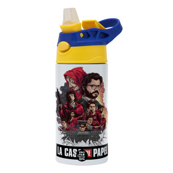 La casa de papel drawing cover, Children's hot water bottle, stainless steel, with safety straw, green, blue (360ml) BPA FREE