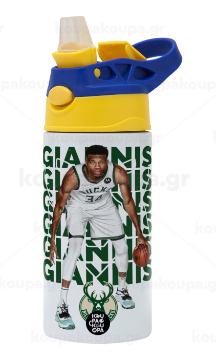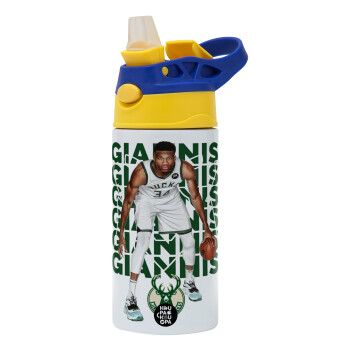 Giannis Antetokounmpo, Children's hot water bottle, stainless steel, with safety straw, green, blue (360ml) BPA FREE