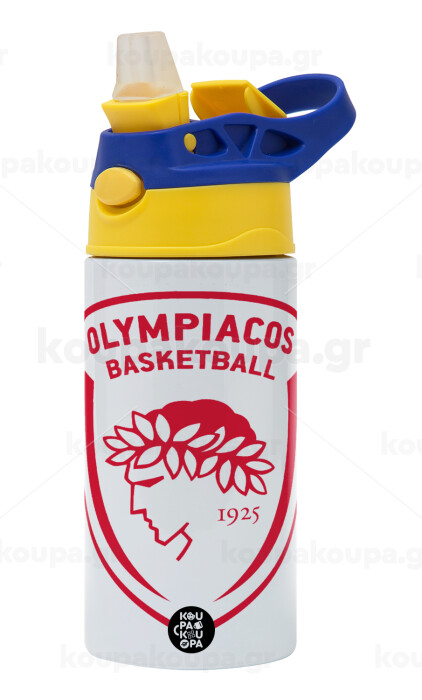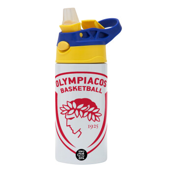 Olympiacos B.C., Children's hot water bottle, stainless steel, with safety straw, green, blue (360ml) BPA FREE