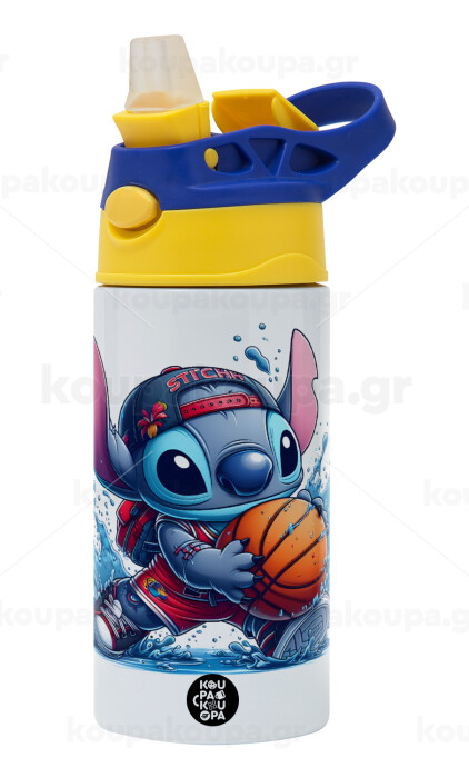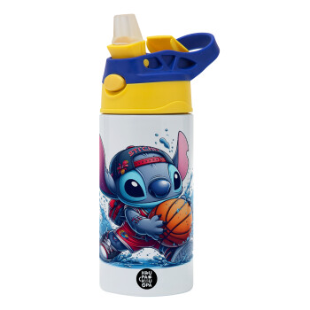 Stitch Basketball, Children's hot water bottle, stainless steel, with safety straw, green, blue (360ml) BPA FREE