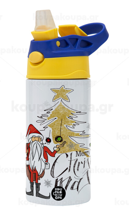 Santa Claus gold, Children's hot water bottle, stainless steel, with safety straw, green, blue (360ml) BPA FREE