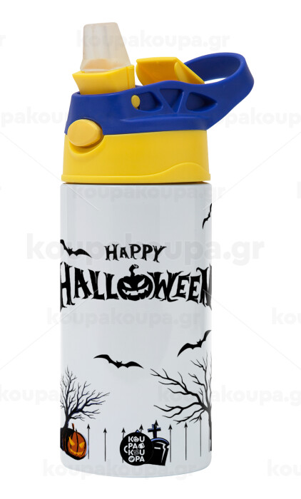 Happy Halloween cemetery, Children's hot water bottle, stainless steel, with safety straw, green, blue (360ml) BPA FREE