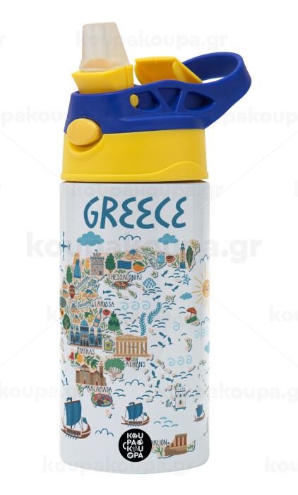Greek map, Children's hot water bottle, stainless steel, with safety straw, green, blue (360ml) BPA FREE