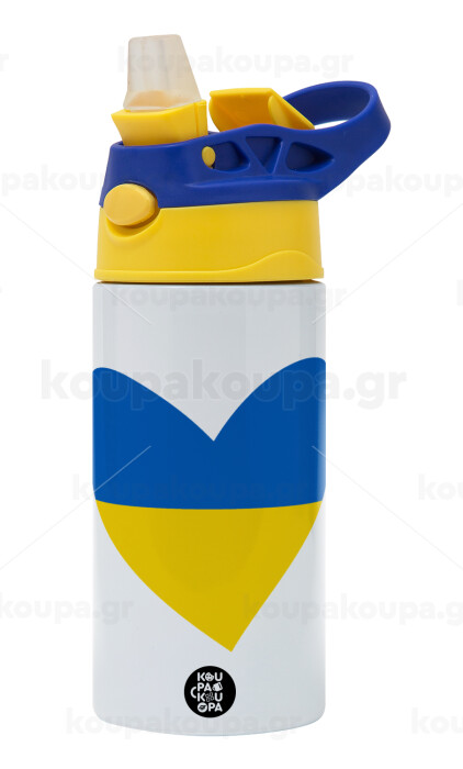 UKRAINE heart, Children's hot water bottle, stainless steel, with safety straw, green, blue (360ml) BPA FREE