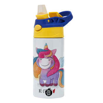 Pink unicorn, Children's hot water bottle, stainless steel, with safety straw, green, blue (360ml) BPA FREE