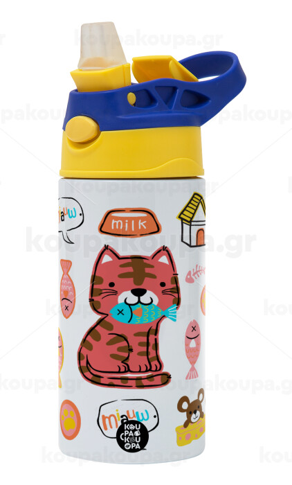 Cats and Fishes, Children's hot water bottle, stainless steel, with safety straw, green, blue (360ml) BPA FREE