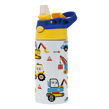 Hand drawing building truck, Children's hot water bottle, stainless steel, with safety straw, green, blue (360ml) BPA FREE
