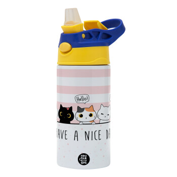 Have a nice day cats, Children's hot water bottle, stainless steel, with safety straw, green, blue (360ml) BPA FREE