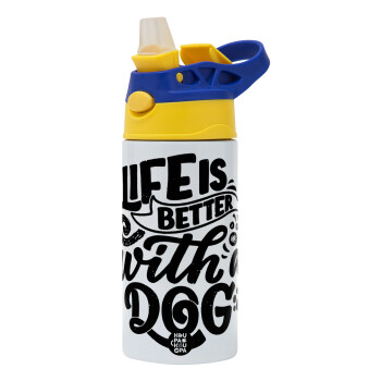 Life is better with a DOG, Children's hot water bottle, stainless steel, with safety straw, green, blue (360ml) BPA FREE