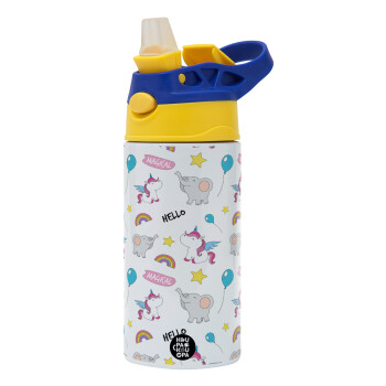 Happy Clouds Doodle, Children's hot water bottle, stainless steel, with safety straw, green, blue (360ml) BPA FREE