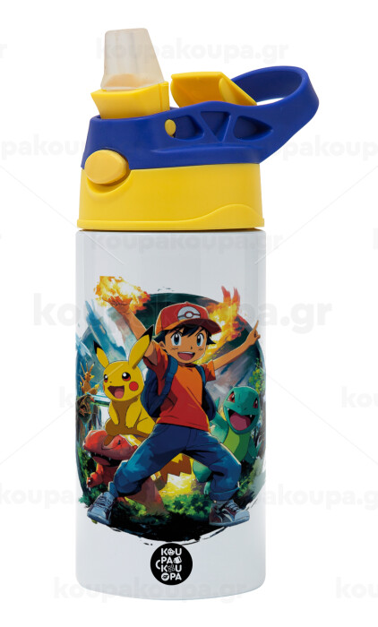 Ash Ketchum & Pikachu, Children's hot water bottle, stainless steel, with safety straw, green, blue (360ml) BPA FREE