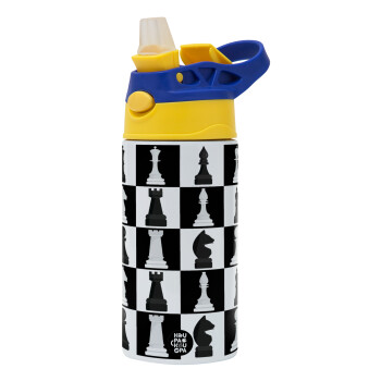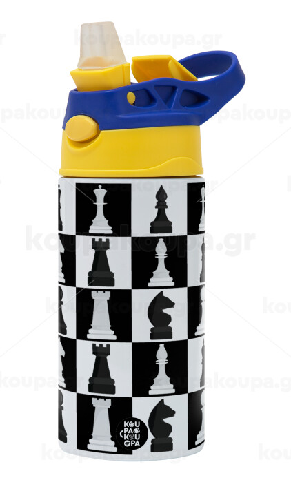 Chess set, Children's hot water bottle, stainless steel, with safety straw, green, blue (360ml) BPA FREE