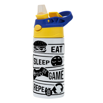 Eat Sleep Game Repeat, Children's hot water bottle, stainless steel, with safety straw, green, blue (360ml) BPA FREE