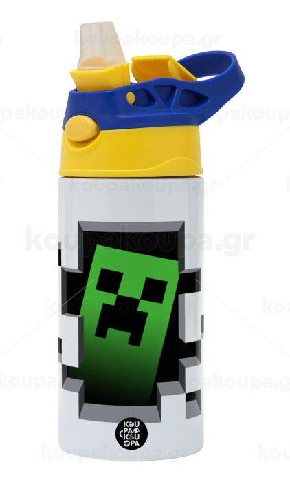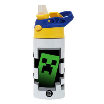 Minecraft creeper, Children's hot water bottle, stainless steel, with safety straw, green, blue (360ml) BPA FREE