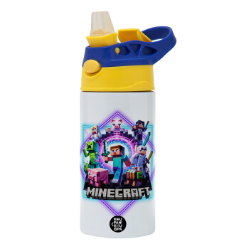 Minecraft Nether Portal, Children's hot water bottle, stainless steel, with safety straw, green, blue (360ml) BPA FREE