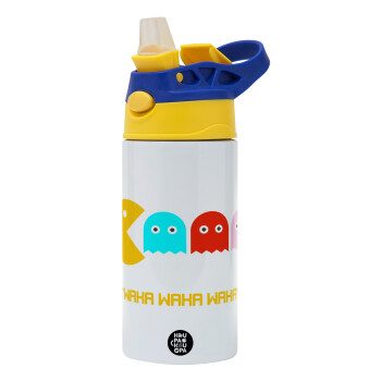 Pacman waka waka waka, Children's hot water bottle, stainless steel, with safety straw, green, blue (360ml) BPA FREE