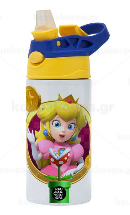 Princess Peach Toadstool, Children's hot water bottle, stainless steel, with safety straw, green, blue (360ml) BPA FREE