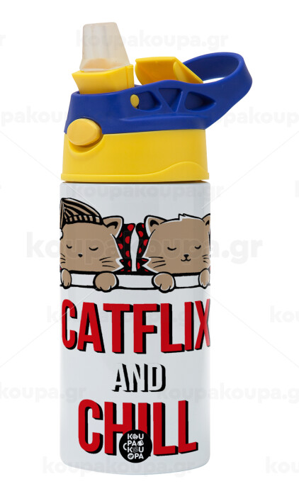 Catflix and Chill, Children's hot water bottle, stainless steel, with safety straw, green, blue (360ml) BPA FREE